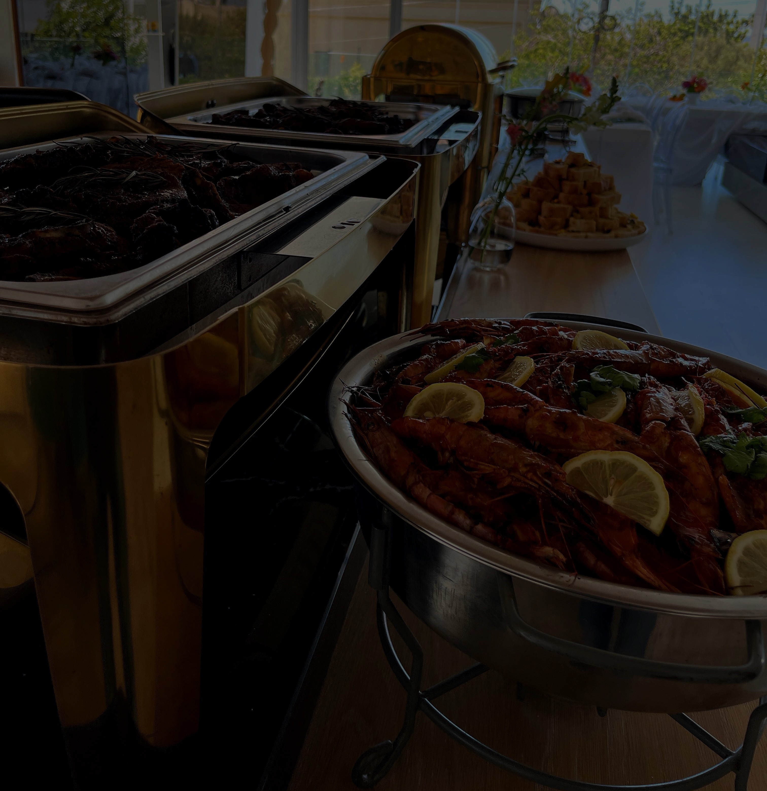 - Tender Marinated Lamb Chops - Steak Fillet Carved, - Grilled Prawns - Dhanya Sausage - Garlic & Parsley Baby Potatoes, - Pepper/Mushroom Sauce (choose one) - Chicken Portions, Kebabs or Sticky Wings (choose one) - Cocktail Garlic Rolls, x 3 Salads R379 pp for 40 or more guests